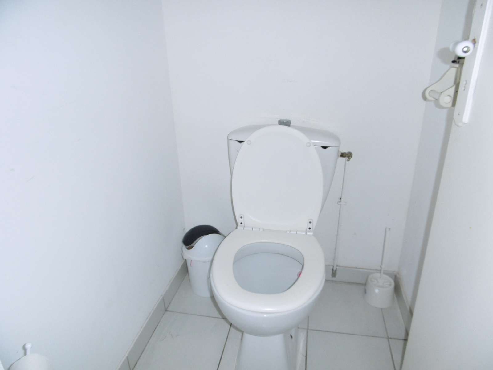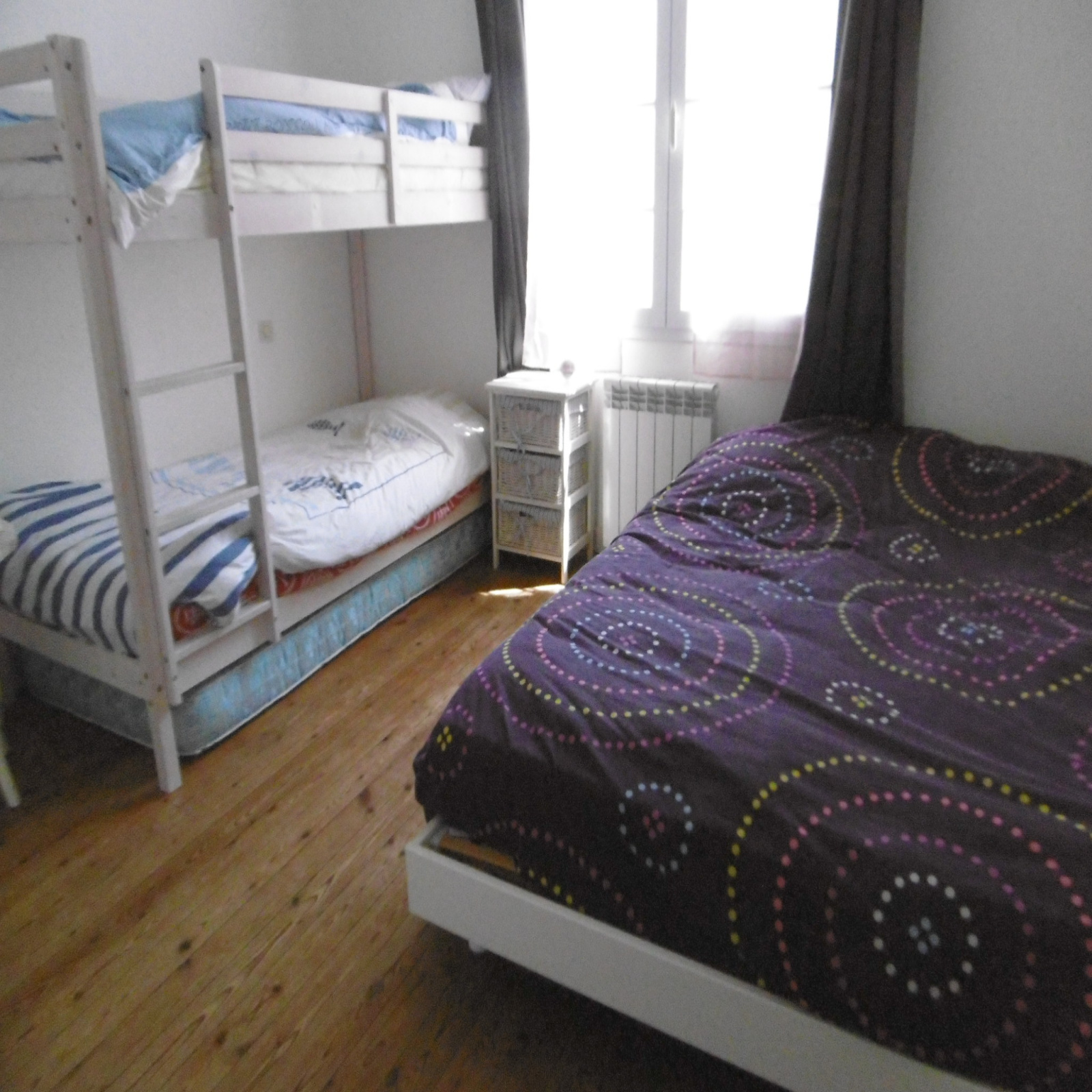 A l'étage: un palier, deux chambres avec placard, une salle de bains avec une fenêtre et des WC.