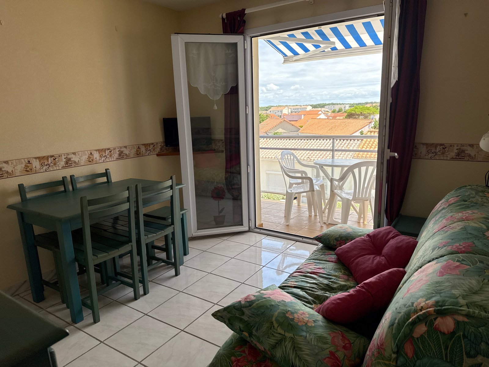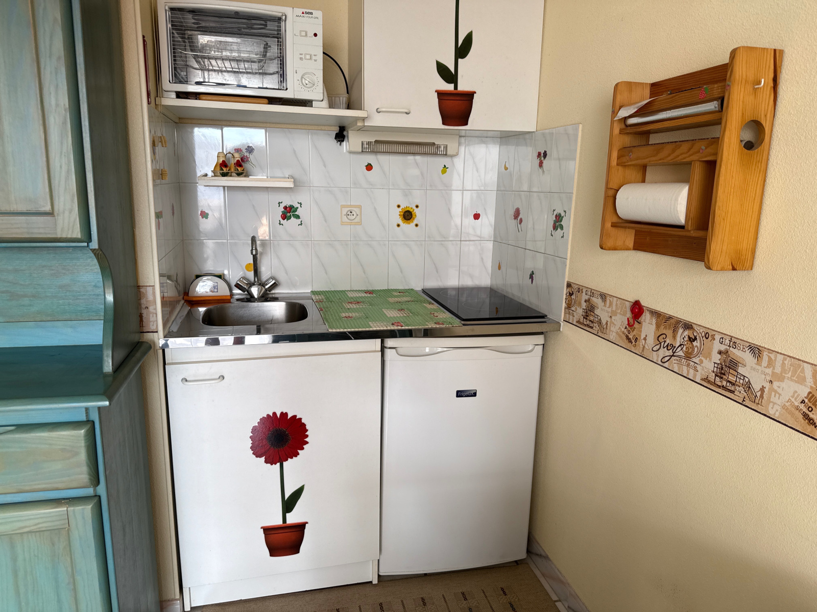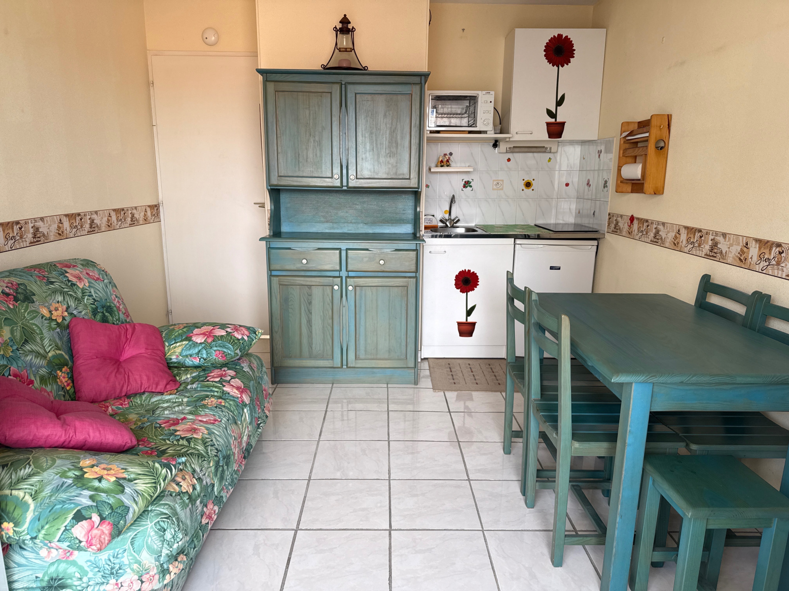 Au 2ème étage d'une petite résidence à faibles charges avec un ascenseur, studio avec un balcon de 4 m² offrant une vue latérale mer et comprenant: une entrée, un coin cuisine équipé ouvert sur un séjour avec un placard et une salle d'eau avec des WC - Local commun pour les vélos - Double vitrage - Chauuffage électrique - Possibilité de garage dans une résidence voisine.