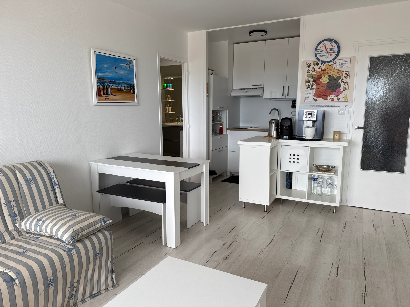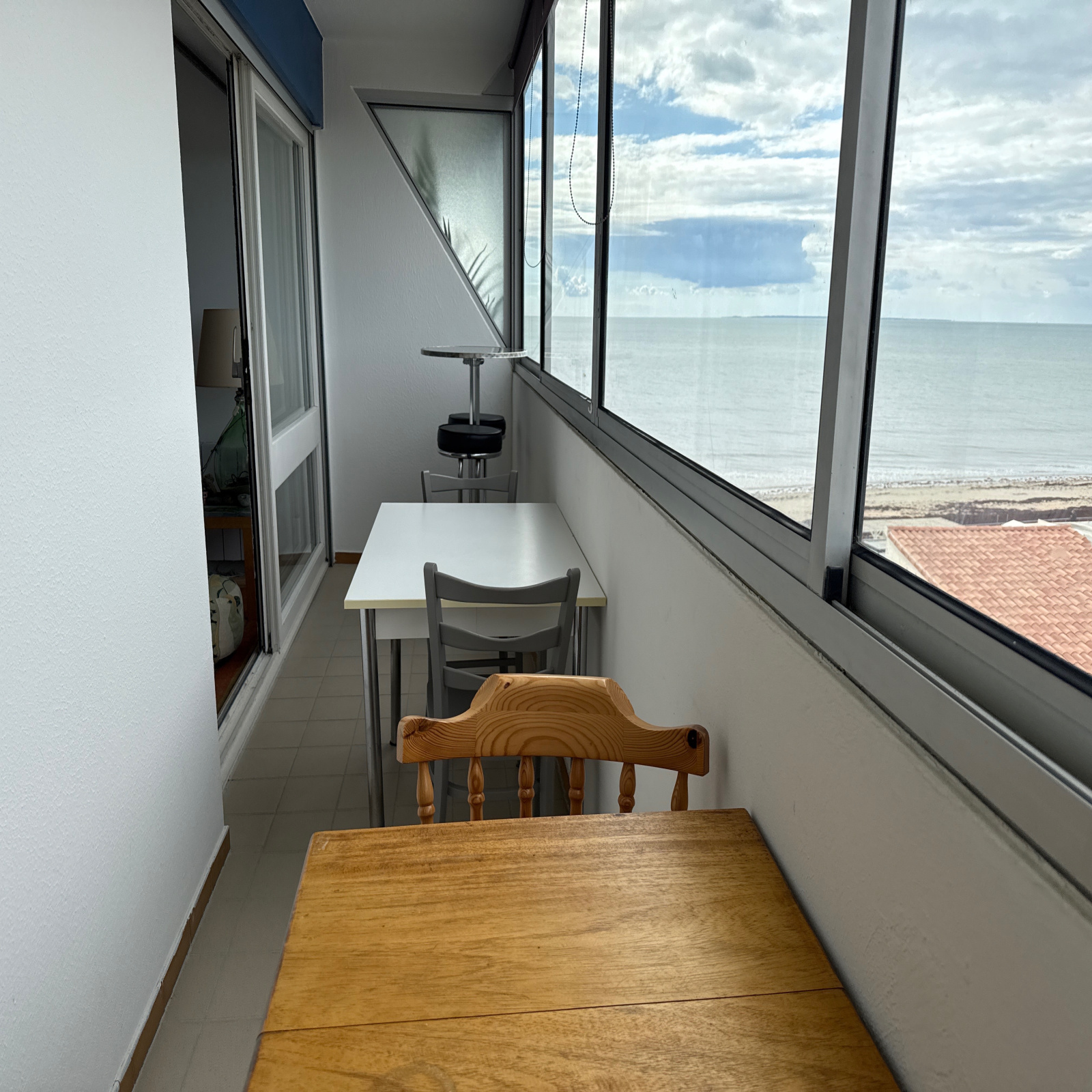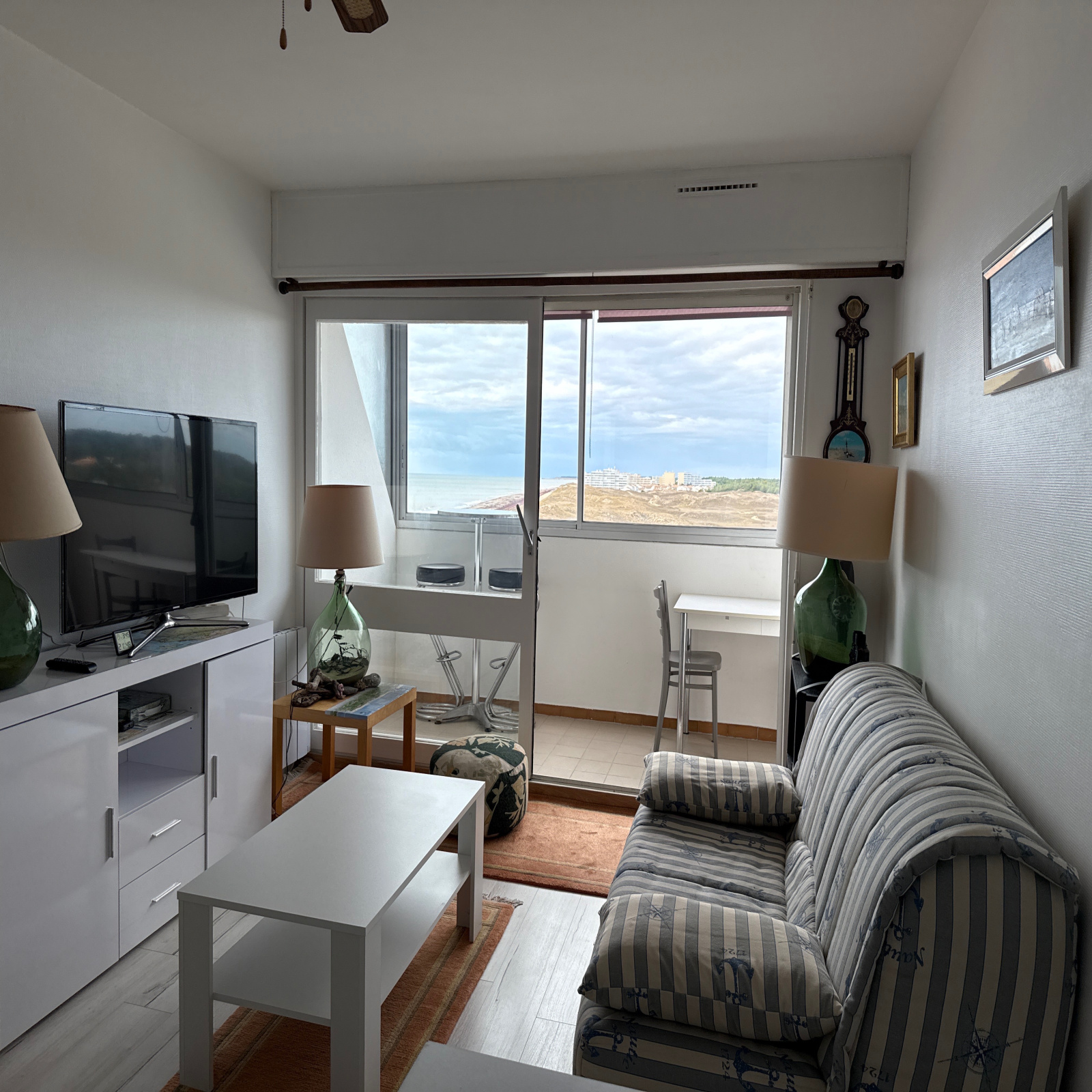 Village les Marines - Au 6ème étage d'une résidence avec un ascenseur, appartement de type 2 entièrement rénové, avec une cave et un garage, comprenant: une entrée, unee cuisine équipée ouverte sur un séjour donnant sur un balcon fermé de 6 m² avec une vue latérale mer et sur les dunes dégagée, une chambre donnant aussi sur le balcon, une salle d'eau et des WC indépendants - Chauffe-eau et chauffage changés - Installation électrique refaite - Vendu meublé et équipé avec un lave-linge et un lave-vaisselle - Habitable de suite.